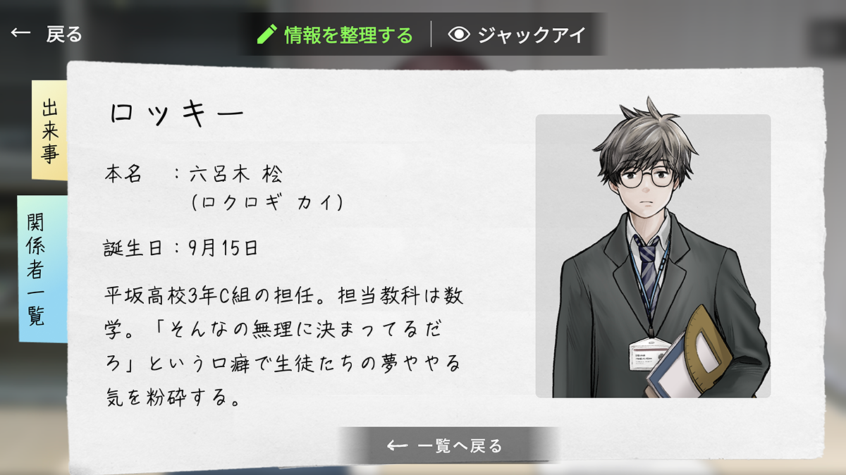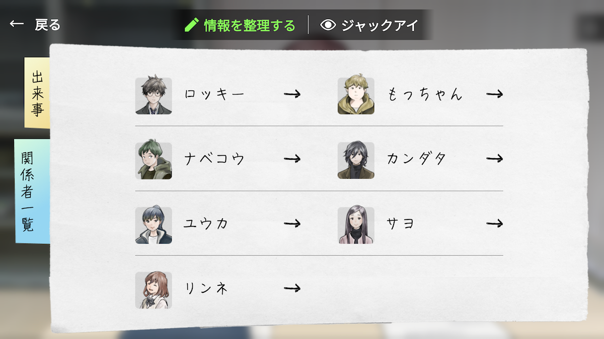 関係者のプロフィールや、その人物がどんな発言や行動をしたかの情報がまとめられています。